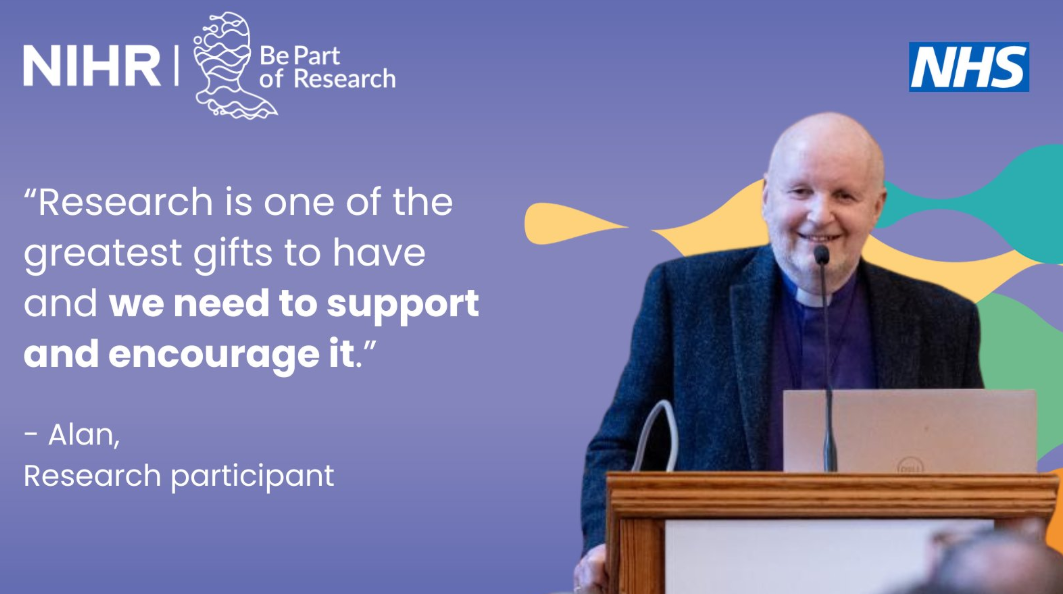 Alan was 61 when he was diagnosed with prostate cancer. He was fit and healthy but worried that this meant his life was going to be cut short. After taking part in a research study for several months, scans showed his cancer was gone. He has been in remission ever since. He said: “I’ve got 6 years of extra life! Medicine saved my life. I got a great kick that this was going to help others. This made it all worthwhile.” Read his story at bepartofresearch.nihr.ac.uk/my-research-st #BePartOfResearch